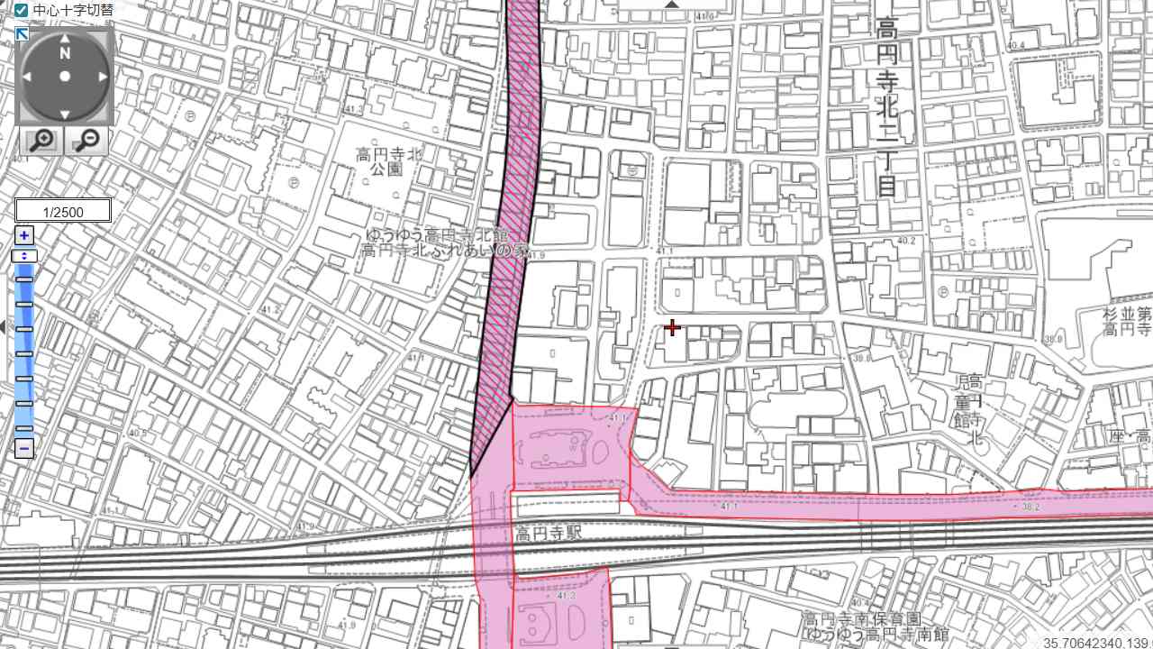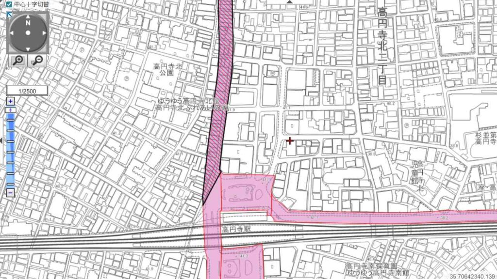 高円寺駅の北側、早稲田通りから駅方面へ向かって一本の計画線が引かれています。これが「東京都市計画道路幹線街路補助線第227号線」です。