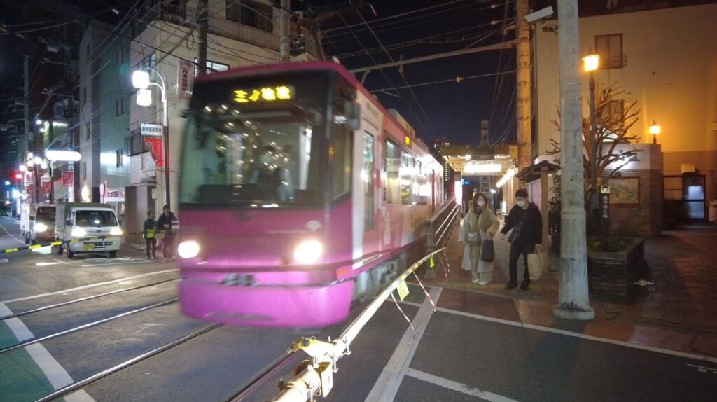 庚申塚通に入ってしばらく歩くと、踏切の警報音が聞こえてきました。 ここは旧中山道と都電荒川線が平面交差する、歴史的な交通の結節点。 踏切を挟んで上下線のホームが互い違いに配置される、路面電車特有の「千鳥式(ちどりしき)」停留場が見えてきます。 東京の夜を走る唯一の都電。そのヘッドライトが近づくにつれ、この散歩も終了です。