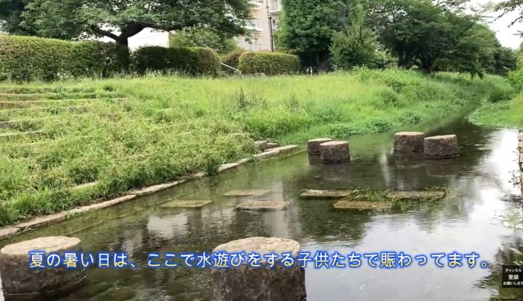 親水広場という名前の通り、水面のすぐ近くまで階段で降りられる造りになっているのが特徴です。透明度の高い澄んだ水が流れており、夏の暑い時期になると、冷たい水遊びを楽しむ子供たちで賑わう人気のスポットへと変化します。