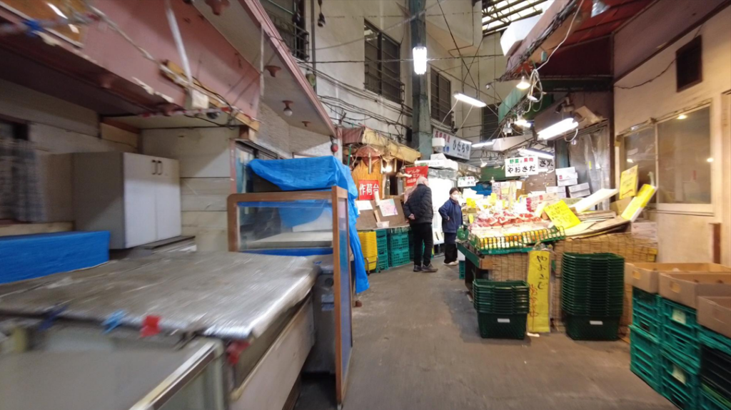 戦後まもない昭和20年代から30年代にかけて誕生したヤミ市や特飲街の面影を色濃く残す、木造建築の屋内市場。トタン屋根に覆われた数十メートルの細暗い通路沿いには、現在も青果店や惣菜店など数店舗が営業を続けており、都内でも貴重となった「昭和30年代の空気」がそのまま保存されたような空間が広がっています。