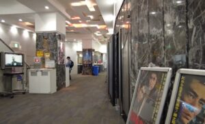 大理石調の壁や柱、そして足元の絨毯など、現代のシネコンにはない重厚で落ち着いた空間です。手前に置かれた名作ポスターや奥に見える売店の佇まいからも、昭和から続く映画館ならではの懐かしい空気を感じ取ることができます。